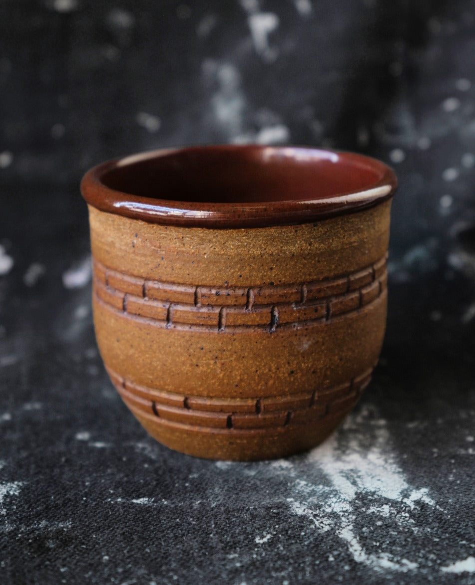 This handmade ceramic cup features warm earthy tones with a matte textured body and a glossy brown rim. The carved brick-like bands add a rustic architectural detail, making it both sturdy and charming — perfect for tea, coffee, or display.